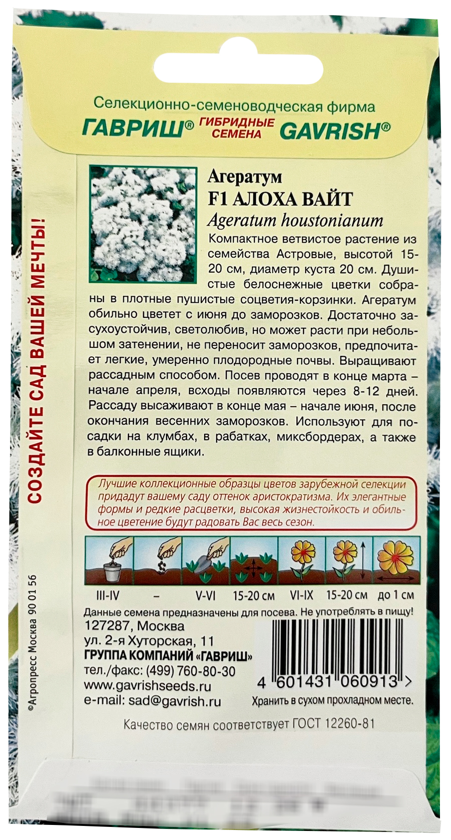 Агератум Алоха Вайт F1 ГАВРИШКомпактное ветвистое растение из семейства Астровые, высотой 15-20 см, диаметр куста 20 см. Душистые белоснежные цветки собраны в плотные пушистые соцветия-корзинки. Агератум обильно цветет с июня до заморозков. Достаточно засухоустойчив, светолюбив, но может расти при небольшом затенении, не переносит заморозков, предпочитает легкие, умеренно плодородные почвы. Выращивают рассадным способом. Посев проводят в конце марта - начале апреля, всходы появляются через 8-12 дней. Рассаду высаживают в конце мая - начале июня, после окончания весенних заморозков. Используют для посадки на клумбах, в рабатках, миксбордерах, а также в балконные ящики.