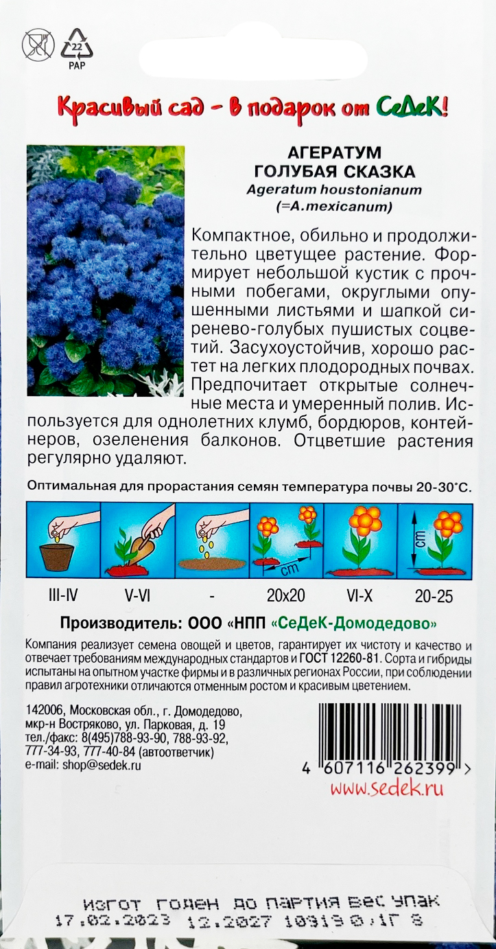 Агератум Голубая СказкаКомпактное, обильно и продолжительно цветущее растение. Формирует небольшой кустик с прочными побегами, округлыми, опушенными листьями и шапкой сиренево-голубых пушистых соцветий. Засухоустойчив, хорошо растет на легких плодородных почвах. Предпочитает открытые солнечные места и умеренный полив. Используется для однолетних клумб, бордюров, контейнеров, озеленения балконов. Отцветшие растения регулярно удаляют.