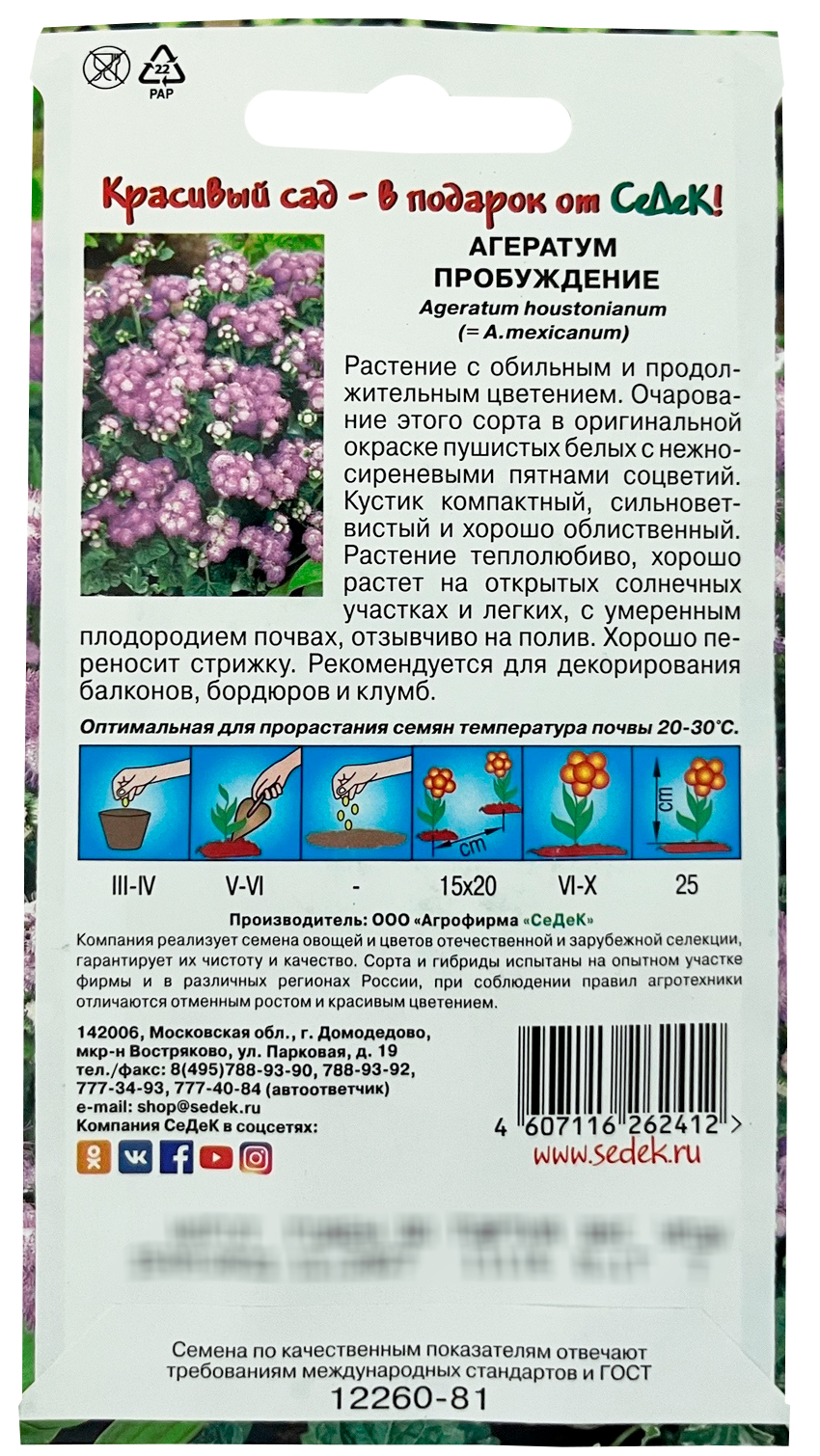 АГЕРАТУМ ПРОБУЖДЕНИЕ СеДеКОчарование этого сорта - в оригинальной и необыкновенно нежной окраске пушистых соцветий. Кустик компактный, сильноветвистый и хорошо облиственный. Многочисленные цветки собраны в небольшие соцветия-корзинки. Растение теплолюбиво, хорошо растет на открытых солнечных участках и легких, с умеренным плодородием почвах; отзывчиво на полив. После стрижки быстро отрастает и обильно цветет. Рекомендуется для декорирования балконов, бордюров, как горшечная культура.
