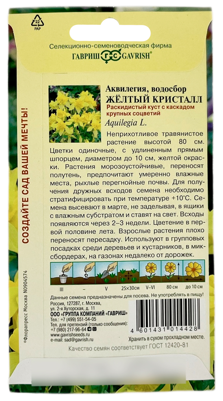 Аквилегия водосбор ЖЁЛТЫЙ КРИСТАЛЛ ГАВРИШНеприхотливое травянистое растение высотой 50 см. Цветки одиночные, с удлиненным прямым шпорцем, диаметром до 10 см, чисто белой окраски. Растения морозоустойчивые, переносят полутень, предпочитают умеренно влажные места, рыхлые перегнойные почвы. Размножают посевом в открытый грунт в мае или под зиму. При весеннем посеве необходимо стратифицировать промораживанием. Цветение в первой половине лета. Взрослые растения плохо переносят пересадку. Используют в групповых посадках среди деревьев и кустарников, в миксбордерах, на газонах недалеко от дорожек.