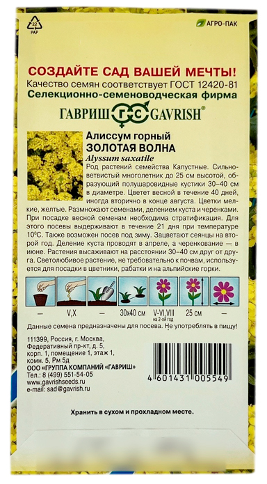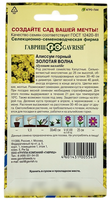 Алиссум горный Золотая волна ГАВРИШРод растений семейства Капустные. Сильноветвистый многолетник до 25 см высотой, образующий полушаровидные кустики 30-40 см в диаметре. Цветет весной в течение 40 дней, иногда вторично в конце августа. Цветки мелкие, желтые. Размножают семенами, делением куста и черенками. Семена высевают в открытый грунт под зиму или весной. Зацветают сеянцы на второй год. Деление куста проводят в апреле, а черенкование - в июне. Растения высаживают на расстоянии 30-40 см друг от друга. Светолюбивое растение, не требовательно к почвам, используется для посадки в цветники, рабатки и на альпийские горки.