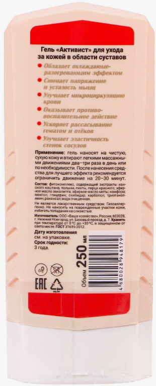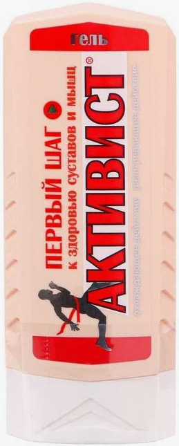 Гель "Активист" - обладает охлаждающе-разогревающим эффектом, снимает напряжение и усталость мышц, улучшает микроциркуляцию крови, оказывает противовоспалительное действие, ускоряет рассасывание гематом и отёков, улучшает эластичность стенок сосудов.Способ применения: гель наносят на чистую, сухую кожу и втирают легкими массажными движениями два-три раза в день или по необходимости. После нанесения средства рекомендуется возможный покой 20-30 минут. Гель можно не смывать.