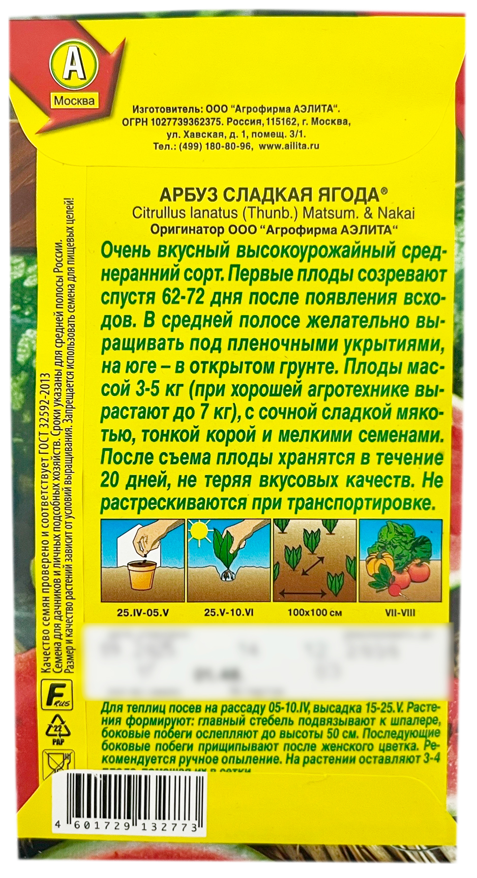 Арбуз СЛАДКАЯ ЯГОДА АЭЛИТАОчень вкусный высокоурожайный среднеранний сорт. Первые плоды созревают спустя 62-72 дня после появления всходов. В средней полосе желательно выращивать под пленочными укрытиями, в южных регионах – в открытом грунте. Плоды округлые, массой 5-7 кг (при хорошей агротехнике вырастают до 12 кг) с сочной сладкой темно-красной мякотью, отличного вкуса и очень мелкими семенами.