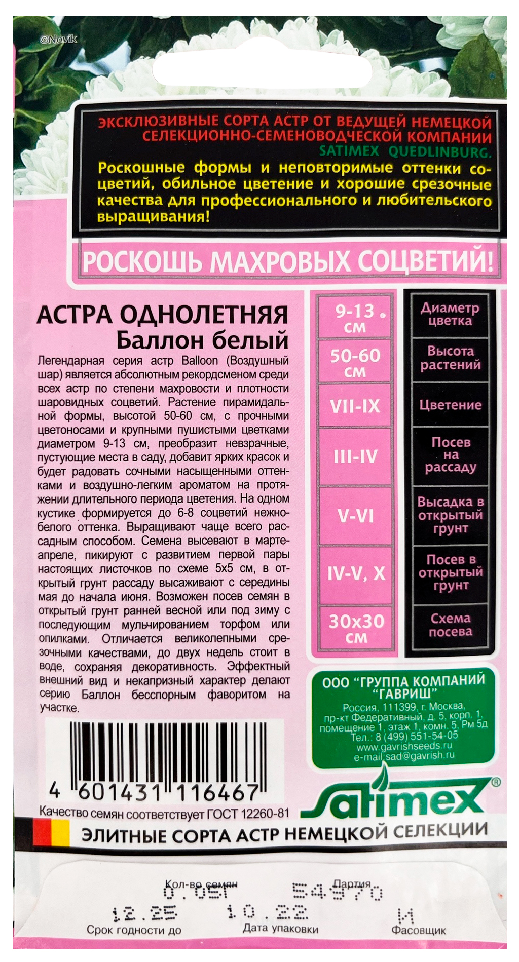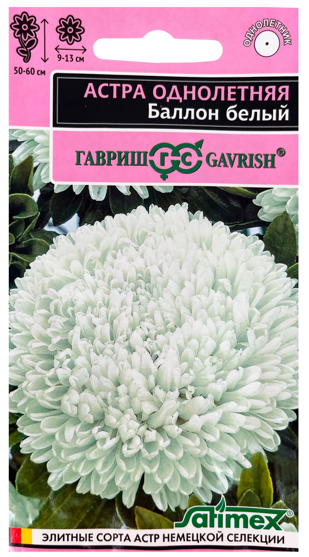 Астра Баллон белый, однолетняя (густомахровая)* 0,05 г серия Эксклюзив Н22Легендарная серия астр Balloon (Воздушный шар) является абсолютным рекордсменом среди всех астр по степени махровости и плотности шаровидных соцветий. Растение пирамидальной формы, высотой 50-60 см с прочными цветоносами и крупными, пушистыми цветками диаметром 9-13 см преобразят невзрачные, пустующие места в саду, добавят ярких красок и будут радовать сочными насыщенными оттенками и воздушно-легким ароматом на протяжении длительного периода цветения. На одном кустике формируется до 6-8 соцветий нежно-белого оттенка. Выращивают, чаще всего, рассадным способом. Семена высевают в марте-апреле, пикируют с развитием первой пары настоящих листочков по схеме 5х5 см, в открытый грунт рассаду высаживают с середины мая до начала июня. Возможен посев семян в открытый грунт ранней весной или под зиму с последующим мульчированием торфом или опилками. Отличаются великолепными срезочными качествами, до двух недель стоят в воде, сохраняя декоративность. Эффектный внешний вид и некапризный характер делает серию Баллон бесспорным фаворитом на участке.