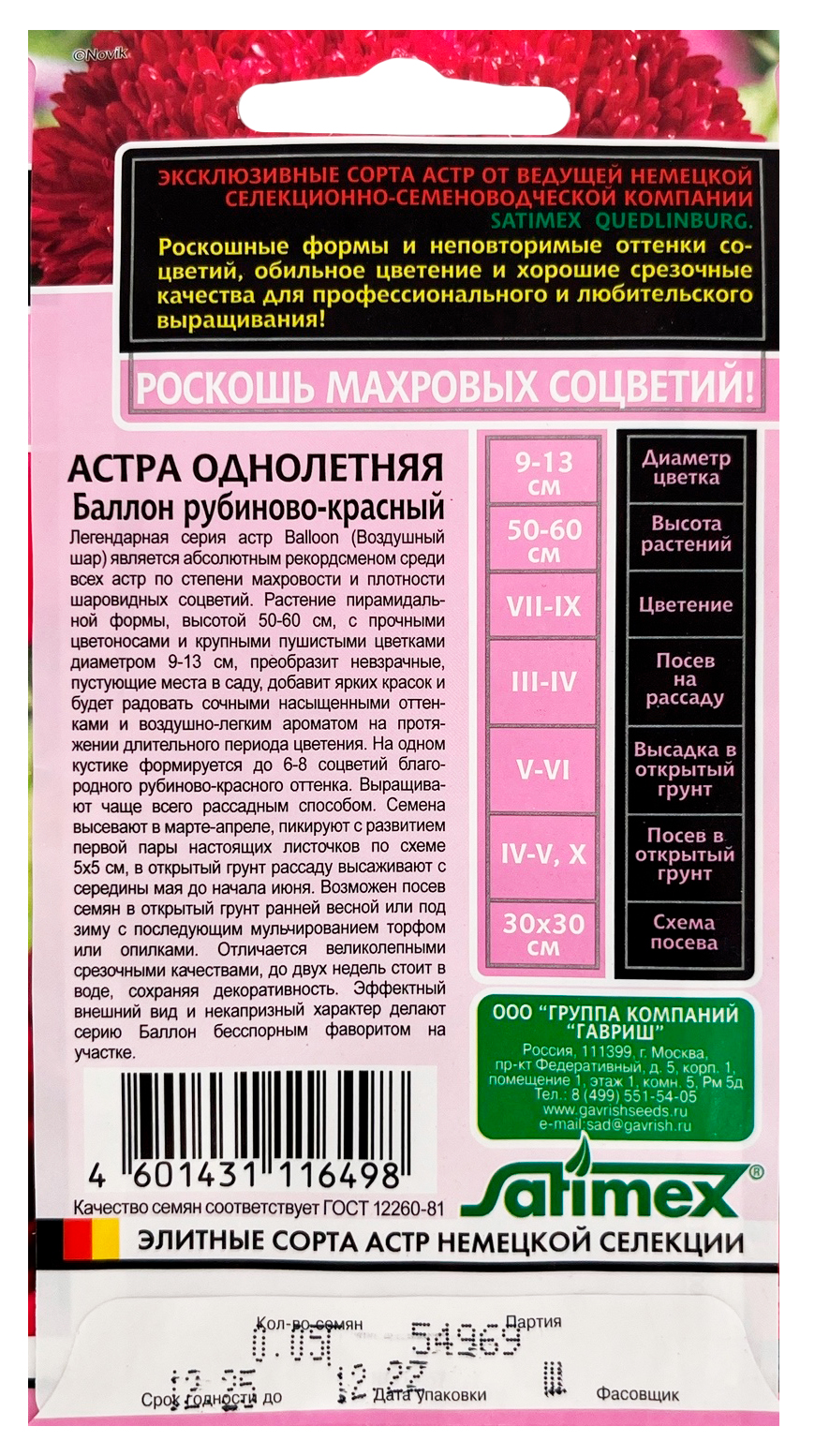 Астра Баллон рубиново- красныйЛегендарная серия астр Balloon (Воздушный шар) является абсолютным рекордсменом среди всех астр по степени махровости и плотности шаровидных соцветий. Растение пирамидальной формы, высотой 50-60 см с прочными цветоносами и крупными, пушистыми цветками диаметром 9-13 см преобразят невзрачные, пустующие места в саду, добавят ярких красок и будут радовать сочными насыщенными оттенками и воздушно-легким ароматом на протяжении длительного периода цветения. На одном кустике формируется до 6-8 соцветий благородного рубиново-красного оттенка. Выращивают, чаще всего, рассадным способом. Семена высевают в марте-апреле, пикируют с развитием первой пары настоящих листочков по схеме 5х5 см, в открытый грунт рассаду высаживают с середины мая до начала июня. Возможен посев семян в открытый грунт ранней весной или под зиму с последующим мульчированием торфом или опилками. Отличаются великолепными срезочными качествами, до двух недель стоят в воде, сохраняя декоративность. Эффектный внешний вид и некапризный характер делает серию Баллон бесспорным фаворитом на участке.