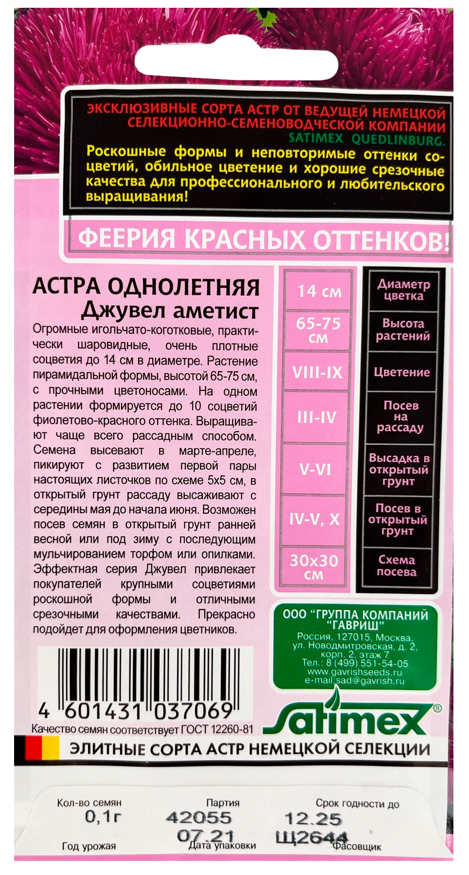 Астра Джувел Аметист, однолетняя (игольчато-коготковая)* 0,05 г серия ЭксклюзивАстра аметист «Джувел» — цветущий однолетник с очень крупными игольчато-коготковыми соцветиями в форме шара. Яркие цветы фиолетово-красного оттенка достигают диаметром до 14 см. Куст конусовидный, вырастает до 65-75 см, дает до 10 соцветий.