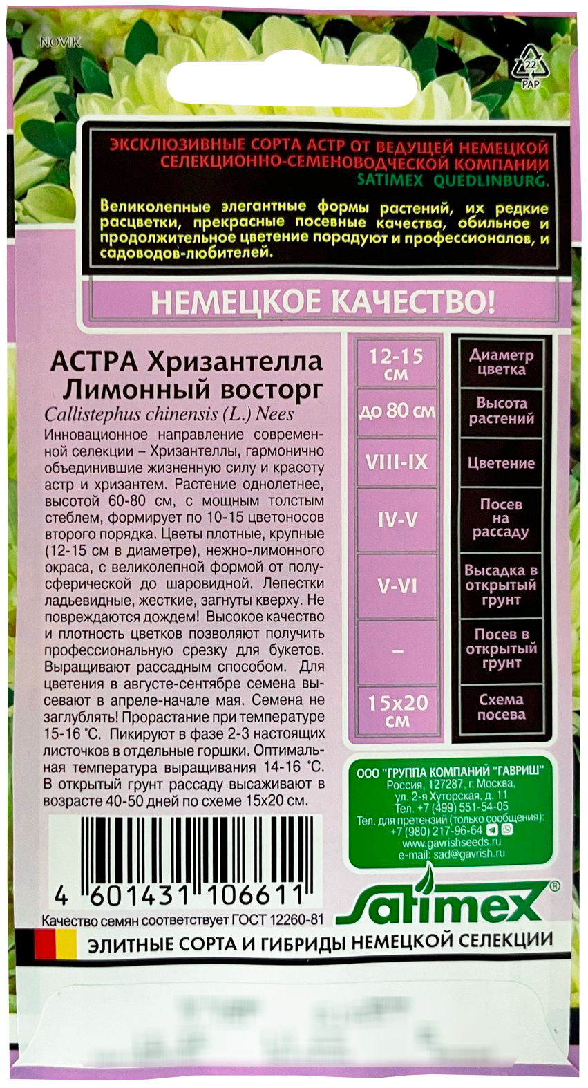 Астра Хризантелла Лимонный восторг Н20Инновационное направление современной селекции – Хризантеллы, гармонично объединившие жизненную силу и красоту астр и хризантем. Растение однолетнее, высотой 60-80 см с мощным толстым стеблем, формирует на одном кусте по 10-15 цветоносов второго порядка. Цветы плотные, крупные (12-15 см в диаметре), нежно- лимонного окраса, с великолепной формой от полусферической до шаровидной. Лепестки ладьевидные, жесткие загнуты к верху. Не повреждаются дождем! Высокое качество и плотность цветков позволяют получать профессиональную срезку для букетов. Выращивают рассадным способом. Для цветения в августе – сентябре семена высевают в апреле начале мая. Семена не заглублять! Прорастание при температуре 15-16 град. Пикируют в фазе 2-3 настоящих листочков в отдельные горшки. Оптимальная температура выращивания 14-16 град. В открытый грунт рассаду высаживают в возрасте 40-50 дней. По схеме 15х20 см.