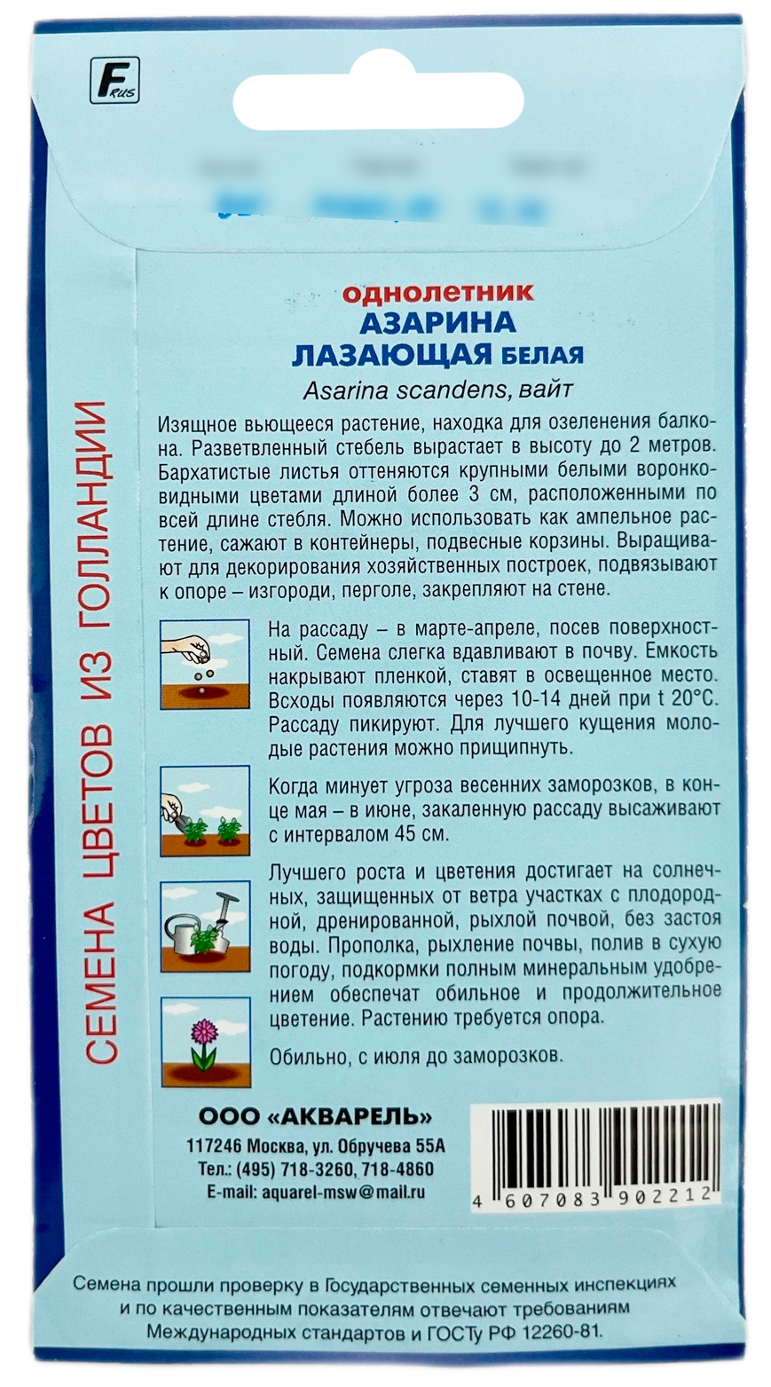 Азарина Лазающая белая (вайт) АКВАРЕЛЬСтебли достигают 2,5 м длины. Бархатистые листья хорошо оттеняют крупные белые воронковидные цветки, располагающиеся по всей длине стебля. Цветёт с июля по сентябрь. Используют для балконов в подвесных корзинах, декорирования заборов и беседок.
