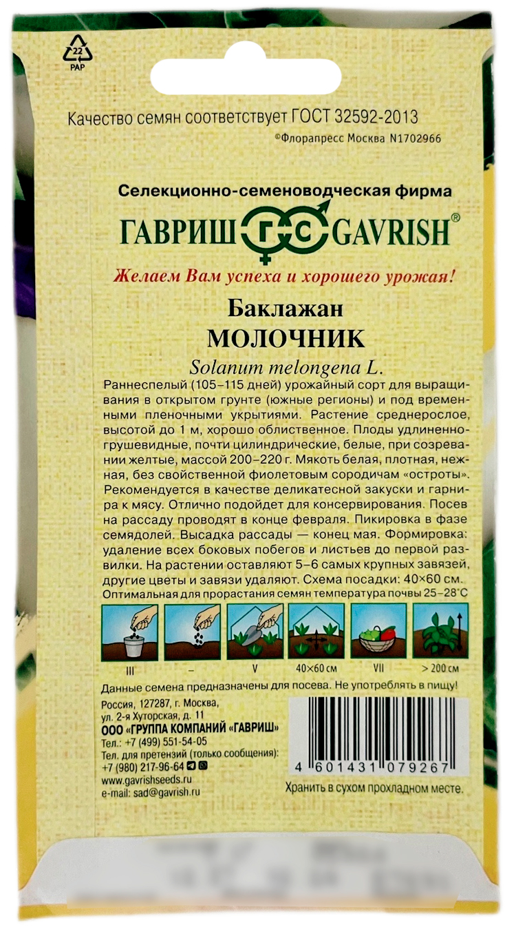 Баклажан МОЛОЧНИК ГАВРИШСреднеранний (105-115 дней) урожайный сорт для выращивания в открытом грунте (южные регионы) и под временными пленочными укрытиями. Растение среднерослое, высотой до 1 м, хорошо облиственное. Плоды удлиненно-грушевидные, почти цилиндрические, белые, при созревании желтые, массой 200-220 г. Мякоть белая, плотная, нежная, без свойственной фиолетовым сородичам "остроты". Рекомендуется в качестве деликатесной закуски и гарнира к мясу. Отлично подойдет для консервирования. Посев на рассаду проводят в конце февраля. Пикировка в фазе семядолей. Высадка рассады – конец мая. Формировка: удаление всех боковых побегов и листьев до первой развилки. На растении оставляют 5-6 самых крупных завязей, другие цветы и завязи удаляют. Схема посадки: 40х60 см.