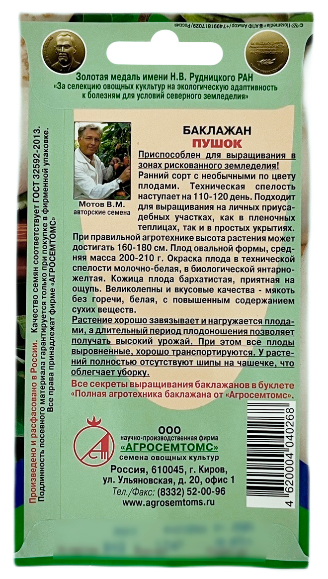 Баклажан ПУШОК АГРОСЕМТОМСРанний сорт для выращивания в плёночных теплицах и простых укрытиях. Техническая спелость наступает на 110-120 день. Куст сильнорослый, полураскидистый, густооблиственный, мощный, без антоциановой окраски. Высота растения 160-180 см. Плод овальной формы, средняя масса 200 – 210 г. мякоть белая, без горечи. Окраска плода в технической спелости белая, в биологической – жёлтая. Кожица плода бархатистая, приятная на ощупь.