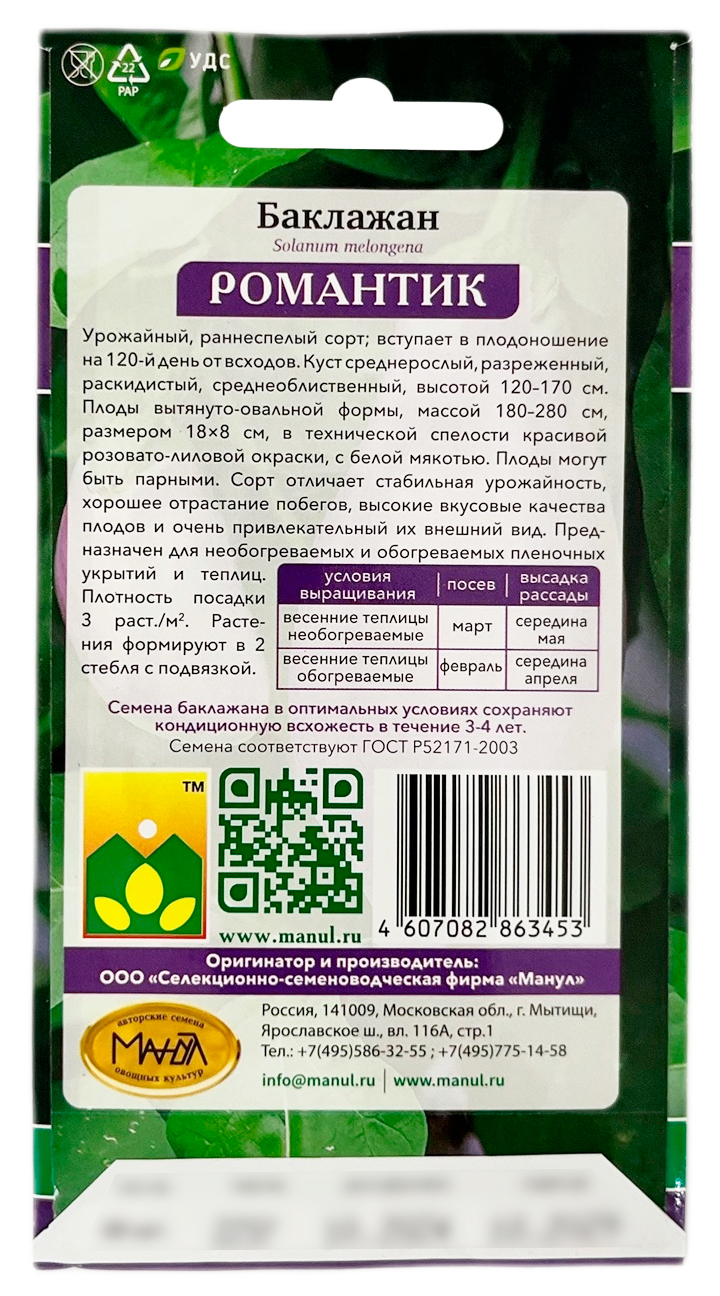 Баклажан РОМАНТИК МАНУЛОсобенности: урожайный, раннеспелый сорт; отличает стабильная урожайность, хорошее отрастание побегов, высокие вкусовые качества плодов и очень привлекательный их внешний вид.