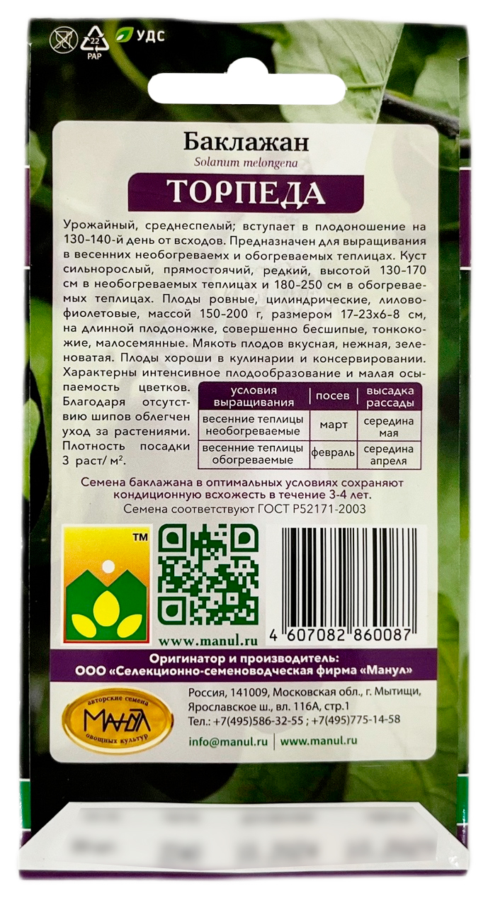 Баклажан ТОРПЕДА МАНУЛБаклажан Торпеда - урожайный, среднеранний сорт; вступает в плодоношение на 125-130-й день от всходов. Куст сильнорослый, прямостоячий, редкий, высотой 130-170 см в необогреваемых теплицах и 180-250 см в обогреваемых теплицах.