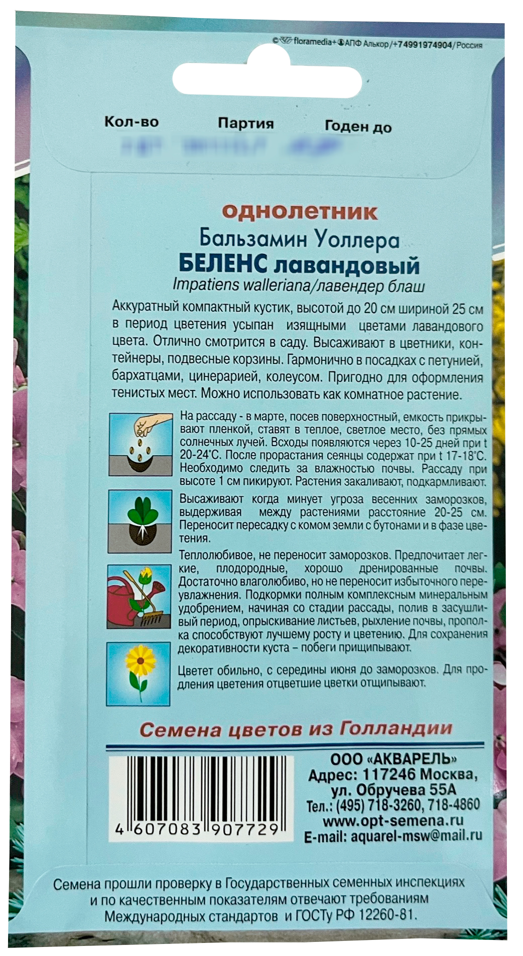 Бальзамин уоллера Беленс лавандовыйАккуратный компактный кустик, высотой до 20 см шириной 25 см в период цветения усыпан изящными цветами лавандового цвета. Отлично смотрится в саду. Высаживают в цветники, контейнеры, подвесные корзины. Гармонично в посадках с петунией, бархатцами, цинерарией, колеусом. Пригодно для оформления тенистых мест. Можно использовать как комнатное растение.