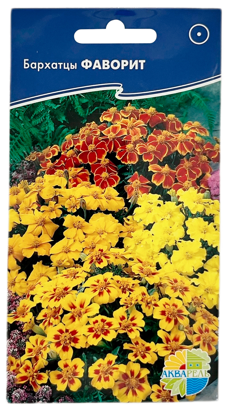 Бархатцы ФАВОРИТ АКВАРЕЛЬКомпактный сильноветвистый кустик высотой 30 см. Соцветия-корзинки диаметром 4-5 см. Растение обладает специфическим ароматом. Используют для окаймления цветников, в групповых посадках на клумбах, для оформления бордюров и вазонных композиций. Сочетается с календулой, сальвией, петунией, вербеной. Оказывает санитарное воздействие на почву.