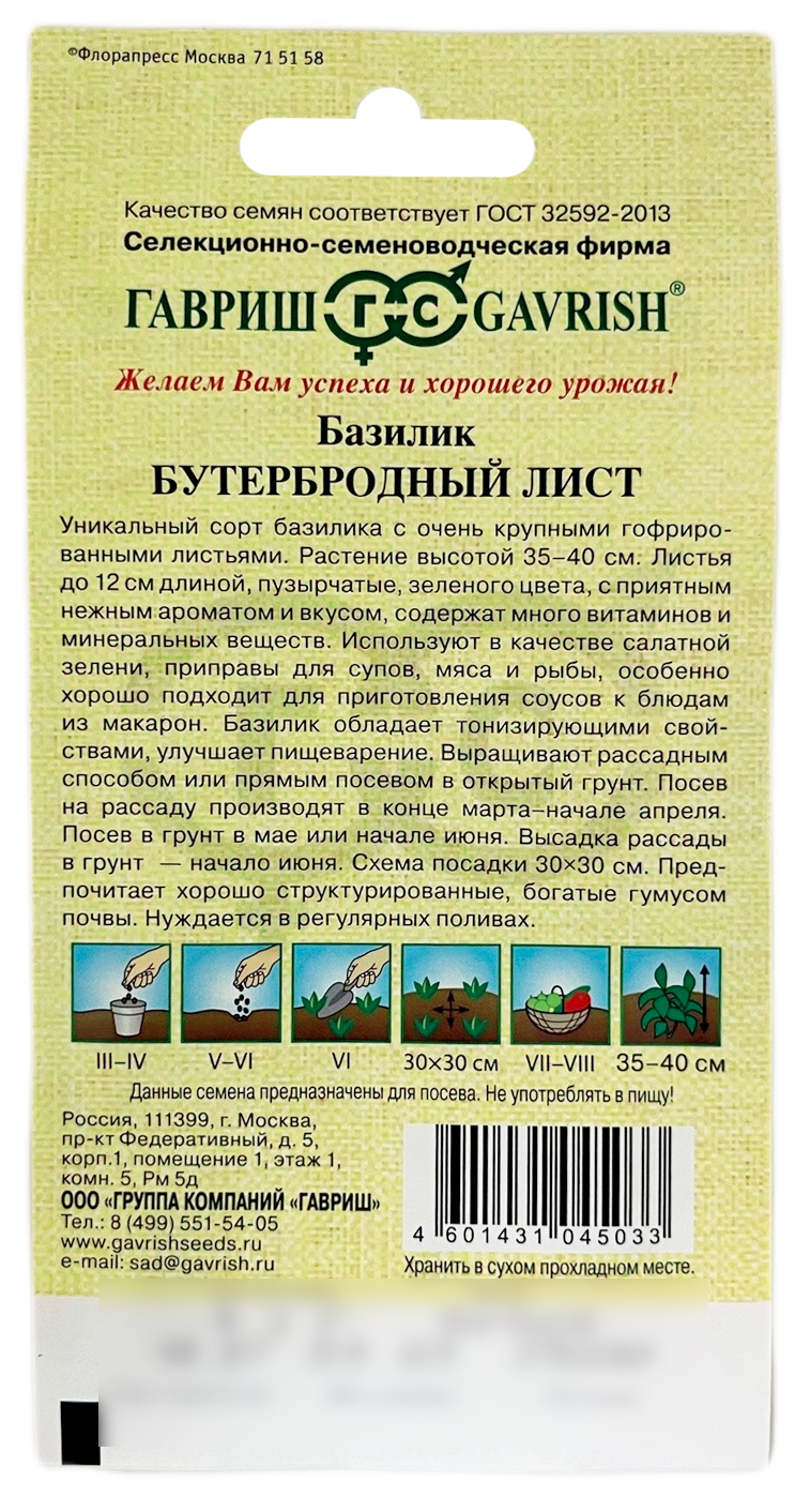 Базилик Бутербродный лист ГАВРИШУникальный сорт базилика с очень крупными гофрированными листьями. Растение высотой 35-40 см. Листья до 12 см длиной, пузырчатые, зеленого цвета, с приятным нежным ароматом и вкусом, содержат много витаминов и минеральных веществ. Используют в качестве салатной зелени, приправы для супов, мяса и рыбы, особенно хорошо подходит для приготовления соусов к блюдам из макарон. Базилик обладает тонизирующими свойствами, улучшает пищеварение. Выращивают рассадным способом или прямым посевом в открытый грунт. Посев на рассаду производят в конце марта – начале апреля. Посев в грунт в мае или начале июня. Высадка рассады в грунт – начало июня. Схема посадки 30x30 см. Предпочитает хорошо структурированные, богатые гумусом почвы. Нуждается в регулярных поливах.