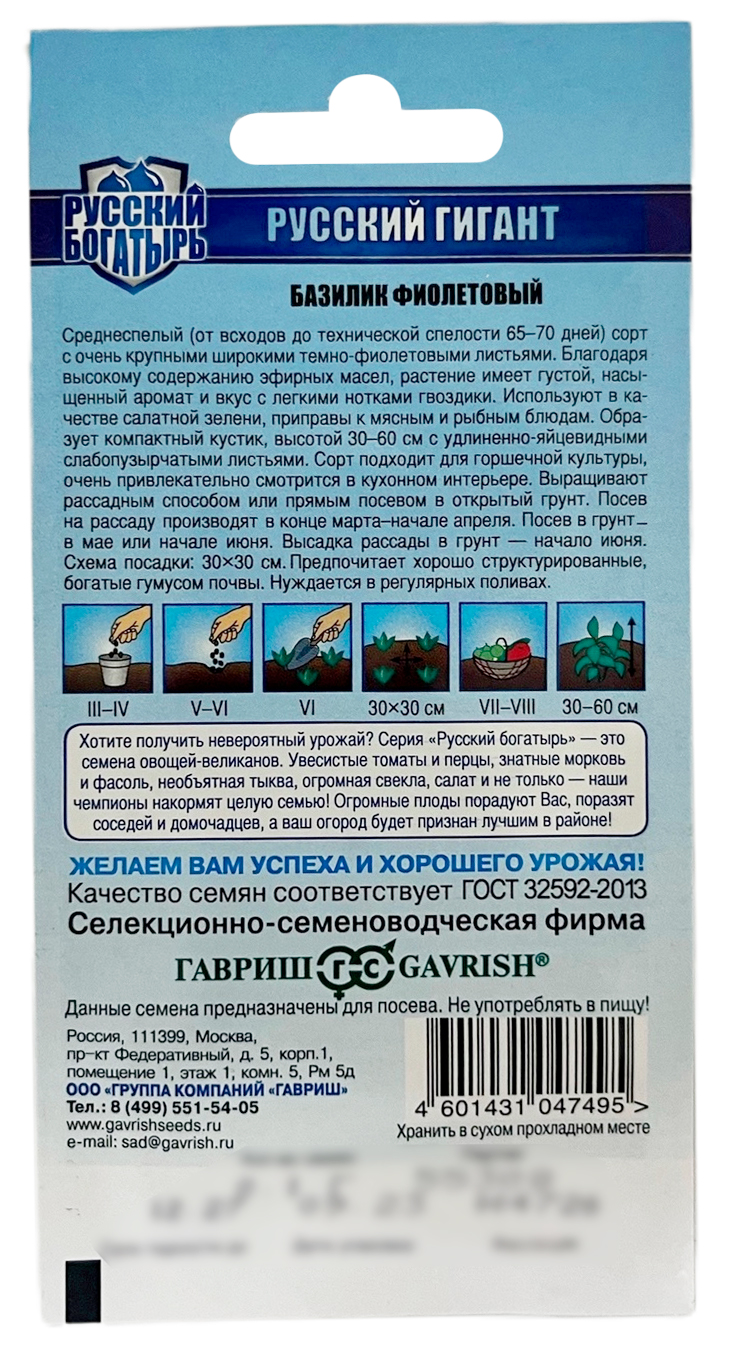 Базилик Русский гигант, фиолетовый серия Русский богатырьСреднеспелый (от всходов до технической спелости 65-70 дней) сорт с очень крупными широкими темно-фиолетовыми листьями. Благодаря высокому содержанию эфирных масел, растение имеет густой, насыщенный аромат и вкус с легкими нотками гвоздики. Используют в качестве салатной зелени, приправы к мясным и рыбным блюдам. Образует компактный кустик, высотой 30-40 см с удлиненно-яйцевидными слабо пузырчатыми листьями. Сорт подходит для горшечной культуры, очень привлекательно смотрится в кухонном интерьере. Выращивают рассадным способом или прямым посевом в открытый грунт. Посев на рассаду производят в конце марта – начале апреля. Посев в грунт в мае или начале июня. Высадка рассады в грунт – начало июня. Схема посадки 30x30 см. Предпочитает хорошо структурированные, богатые гумусом почвы. Нуждается в регулярных поливах.