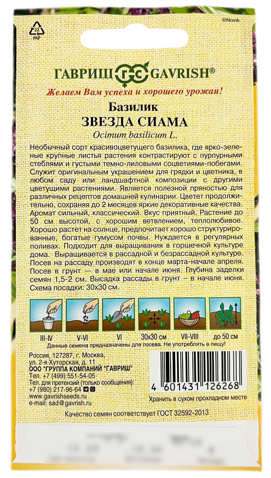 Базилик ЗВЕЗДА СИАМА ГАВРИШНеобычный сорт красивоцветущего базилика, где ярко-зеленые крупные листья растения контрастируют с пурпурными стеблями и густыми темно-лиловыми соцветиями-побегами. Служит оригинальным украшением для грядки и цветника, в любом саду или ландшафтной композиции с другими цветущими растениями. Является полезной пряностью для различных рецептов домашней кулинарии. Цветет продолжительно, сохраняя до 2 месяцев яркие декоративные качества. Аромат сильный, классический. Вкус приятный. Растение до 50 см высотой, с хорошим ветвлением, теплолюбивое. Хорошо растет на солнце, предпочитает хорошо структурированные, богатые гумусом почвы. Нуждается в регулярных поливах. Подходит для выращивания в горшечной культуре дома. Выращивается в рассадной и безрассадной культуре. Посев на рассаду производят в конце марта – начале апреля. Посев в грунт — в мае или начале июня. Глубина заделки семян 1,5-2 см. Высадка рассады в грунт – в начале июня. Схема посадки: 30x30 см.