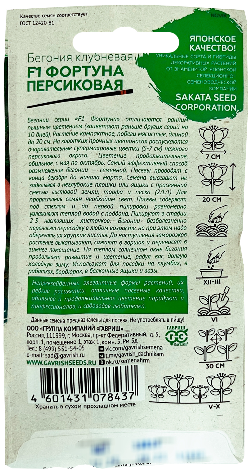 Семена Бегония клубневая Фортуна Персиковая F1, 4шт, Гавриш, Элитные сорта и гибриды, SakataБегонии серии «F1 Фортуна» отличаются ранним пышным цветением (зацветает раньше других серий на 10 дней). Растение компактное, побеги мясистые, длиной до 20 см. На коротких прочных цветоносах распускаются очаровательные супермахровые цветки (5-7 см) нежного персикового окраса. Цветение продолжительное, обильное, с мая по октябрь. Самый эффективный способ размножения бегонии — семенной. Посевы производят с конца декабря до начала марта. Семена высевают, не заделывая в неглубокие плошки или ящики с просеянной смесью листовой земли, торфа или песка (2:1:1). Посевы содержат под стеклом и до первой пикировки равномерно увлажняют теплой водой с поддона. Пикируют в стадии 2-3-х настоящих листочков. Бегонии безболезненно переносят пересадку в любом возрасте, но при этом надо оберегать их хрупкие листья. До наступления заморозков кустик выкапывают, сажают в горшок, и переносят в зимнее помещение. На теплом солнечном окне бегония продолжает развитие и цветение, радуя вас долгую, холодную зиму. Используется для посадки на клумбах, в рабатках, бордюрах, в балконные ящики и вазы.