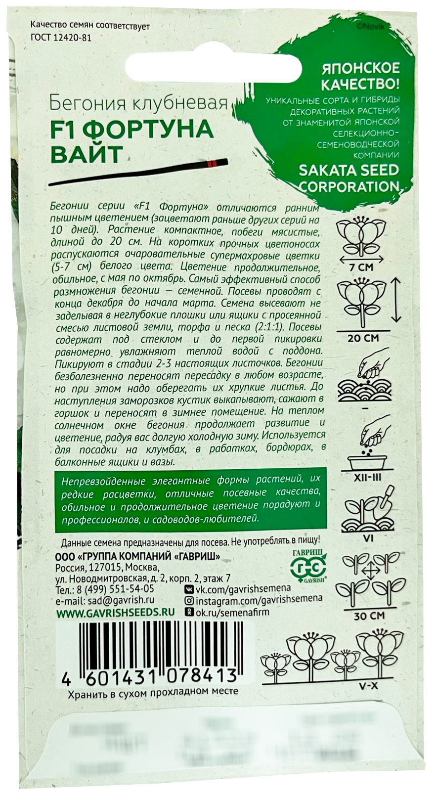Семена Бегония клубневая Фортуна Вайт F1, 4шт, Гавриш, Элитные сорта и гибриды, SakataБегонии серии «F1 Фортуна» отличаются ранним пышным цветением (зацветает раньше других серий на 10 дней). Растение компактное, побеги мясистые, длиной до 20 см. На коротких прочных цветоносах распускаются очаровательные супермахровые цветки (5-7 см) белого цвета. Цветение продолжительное, обильное, с мая по октябрь. Самый эффективный способ размножения бегонии — семенной. Посевы производят с конца декабря до начала марта. Семена высевают, не заделывая в неглубокие плошки или ящики с просеянной смесью листовой земли, торфа или песка (2:1:1). Посевы содержат под стеклом и до первой пикировки равномерно увлажняют теплой водой с поддона. Пикируют в стадии 2-3-х настоящих листочков. Бегонии безболезненно переносят пересадку в любом возрасте, но при этом надо оберегать их хрупкие листья. До наступления заморозков кустик выкапывают, сажают в горшок, и переносят в зимнее помещение. На теплом солнечном окне бегония продолжает развитие и цветение, радуя вас долгую, холодную зиму. Используется для посадки на клумбах, в рабатках, бордюрах, в балконные ящики и вазы.