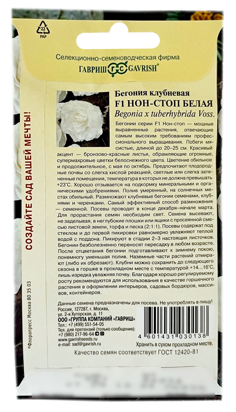 Бегония клубневая НОН СТОП БЕЛАЯ ГАВРИШБегонии серии F1 Нон-стоп – мощные выравненные растения, отвечающие самым высоким требованиям профессионального выращивания. Побеги мясистые, длиной до 20-25 см. Красивый акцент — бронзово-красные листья, обрамляющие огромные, супермахровые цветки белоснежного цвета. Цветение обильное и продолжительное, с мая по октябрь. Предпочитают плодородные почвы со слегка кислой реакцией, светлые или слегка затененные помещения, температура в которых не должна превышать 23 °C. Хорошо отзывается на подкормку минеральными и органическими удобрениями. Полив умеренный, на солнечных местах обильный. Размножают клубневые бегонии семенами, клубнями и черенками. Самый эффективный способ размножения – семенной.
