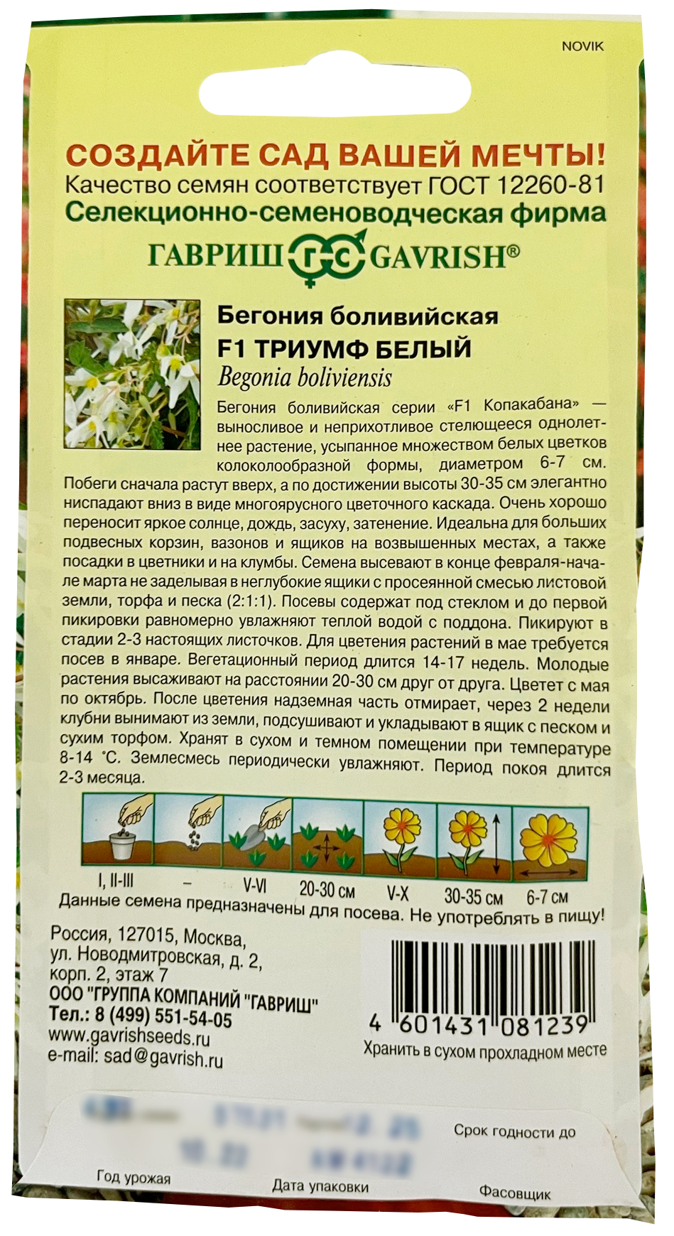 Бегония Триумф белый боливийская F1Бегония боливийская серии «F1 Копакабана» - выносливое и неприхотливое стелющееся однолетнее растение, усыпанное множеством белых цветков колоколообразной формы диаметром 6-7 см. Побеги сначала растут вверх, а по достижении высоты 30-35 см элегантно ниспадают вниз в виде многоярусного цветочного каскада. Очень хорошо переносит яркое солнце, дождь, засуху, затенение. Идеальна для больших подвесных корзин, вазонов и ящиков на возвышенных местах, а также посадки в цветники и клумбы. Семена высевают в конце февраля-начале марта, не заделывая, в неглубокие ящики с просеянной смесью листовой земли, торфа и песка (2:1:1). Посевы содержат под стеклом и до первой пикировки равномерно увлажняют теплой водой с поддона. Пикируют в стадии 2-3 настоящих листочков. Для цветения растений в мае требуется посев в январе. Вегетационный период длится 14-17 недель. Молодые растения высаживают на расстоянии 20-30 см друг от друга. Цветет с мая по октябрь. После цветения надземная часть отмирает и через 2 недели клубни вынимают из земли, подсушивают и укладывают в ящик с песком и сухим торфом. Хранят в сухом и темном помещении при температуре 8-14оС. Землесмесь периодически увлажняют. Период покоя длится 2-3 месяца.