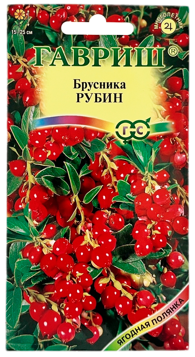 Брусника РУБИН ГАВРИШПозднеспелый урожайный сорт брусники. Вечнозеленый почвопокровный кустарник высотой 15–25 см. Листья мелкие, гладкие, эллиптической формы, темно-зеленые. Цветки бледно-розовые, напоминающие маленькие колокольчики. Цветет в мае-июне. Плодоносит в августе-сентябре. Плоды округлые, вначале зеленовато-белые, затем темно-красные, блестящие, кисло-сладкие, массой 0,25 г. Брусника имеет богатейший химический состав. Используется в качестве лекарственного средства. Растение светолюбивое, предпочитает кислые хорошо дренированные почвы. Посев семян производят весной. Семена стратифицируют 3 месяца при температуре 3-5°С во влажном песке (на нижней полке холодильника). В фазе 4-5 настоящих листьев сеянцы пересаживают в теплицу и доращивают в течение года. В августе с теплицы снимают укрытие, а в октябре мульчируют торфом (слой 5-7 см) и накрывают 2 слоями спанбонда. Весной укрытие снимают и пересаживают молодые растения в школку, где они выращиваются в течение 1-2 лет, после чего их высаживают на постоянное место.