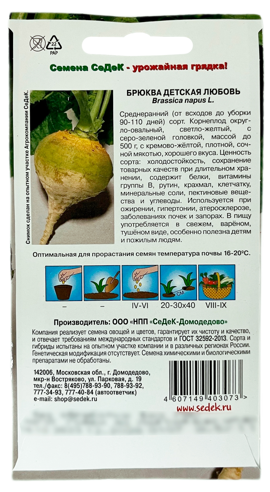 Брюква Детская Любовь СеДеКСреднеранний (от всходов до уборки 90-110 дней) сорт. Корнеплод округло-овальный, светло-желтый, с серо-зеленой головкой, массой до 500 г, с кремово-жёлтой, плотной, сочной мякотью, хорошего вкуса. Ценность сорта: холодостойкость, сохранение товарных качеств при длительном хранении, содержит белки, витамины группы В, рутин, крахмал, клетчатку, минеральные соли, пектиновые вещества и углеводы. Используется при ожирении, гипертонии, атеросклерозе, заболевании почек и запорах. В пищу употребляется в свежем, варённом, тушёном виде, особенно полезна детям и пожилым людям.
