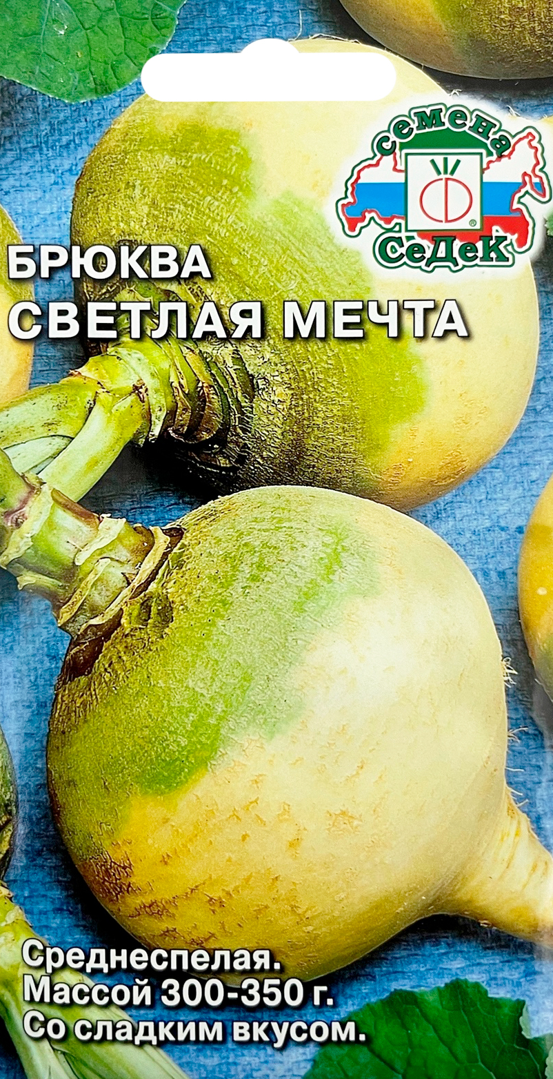 Брюква Светлая мечта СеДеКСреднеспелый (115-125 дней) сорт, относится к растениям длинного дня. Корнеплоды овальные желтовато-зеленоватые, массой 300-350 г. Мякоть твердая, интенсивно желтая, сладкая. Ценность сорта: устойчивость к цветушности, холодостойкость. Содержит минеральные соли и углеводы. В народной медицине используется как витаминное, мочегонное, антисептическое, ранозаживляющее средство. Рекомендуется для употребления в свежем и переработанном виде, для хранения.