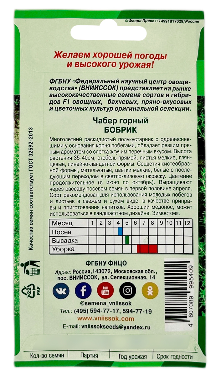 Чебер горный БОБРИК ВНИИССОКМноголетний раскидистый полукустарник с одревесневшими у основания корня побегами, обладает резким пряным ароматом со слегка жгучим перечным вкусом. Высота растения 35-40 см, стебель прямой, листья мелкие, глянцевые, линейно-ланцетной формы. Соцветия кистеобразной формы, метельчатые, цветки мелкие, белые с последующим переходом в светло-лиловую окраску. Цветение продолжительное (с июня по октябрь). Выращивают через рассаду посевом семян в первой половине апреля. Сорт рекомендован для использования молодых побегов и листьев в свежем и сухом виде, в качестве приправы и приготовления напитков. Хороший медонос, может использоваться в ландшафтном дизайне. Зимостоек.