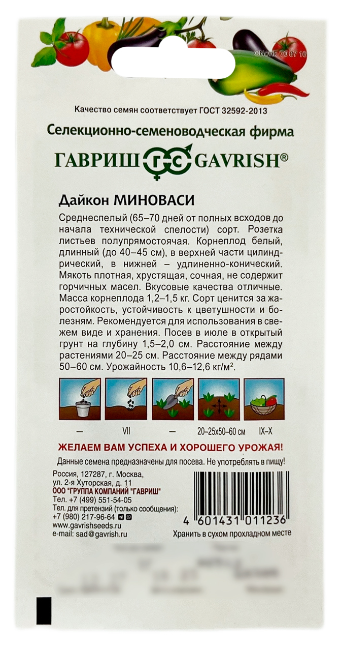Дайкон МИНОВАСИ ГАВРИШСреднеспелый сорт (период от всходов до уборки урожая составляет 50-60 дней). Корнеплоды чисто белые, в верхней части цилиндрические, в нижней - удлиненно-конические, на 3/4 заглублены в почву. Длина 40-45 см, максимально до 60 см, диаметр - 7-9 см. Мякоть плотная, хрустящая, очень сочная, нежная. Вкусовые качества отличные. Лишен редечного горьковато-острого вкуса, так как не содержит горчичных масел. Посев в июле в открытый грунт, глубина заделки семян 1,5-2 см. Всходы появляются на 3-5 день. Уборка корнеплодов во второй половине сентября или в октябре. Сорт жаростойкий, устойчив к болезням. Используют в свежем виде и для хранения. Расстояние между растениями: 20-25 см. Расстояние между рядами: 50-60 см.