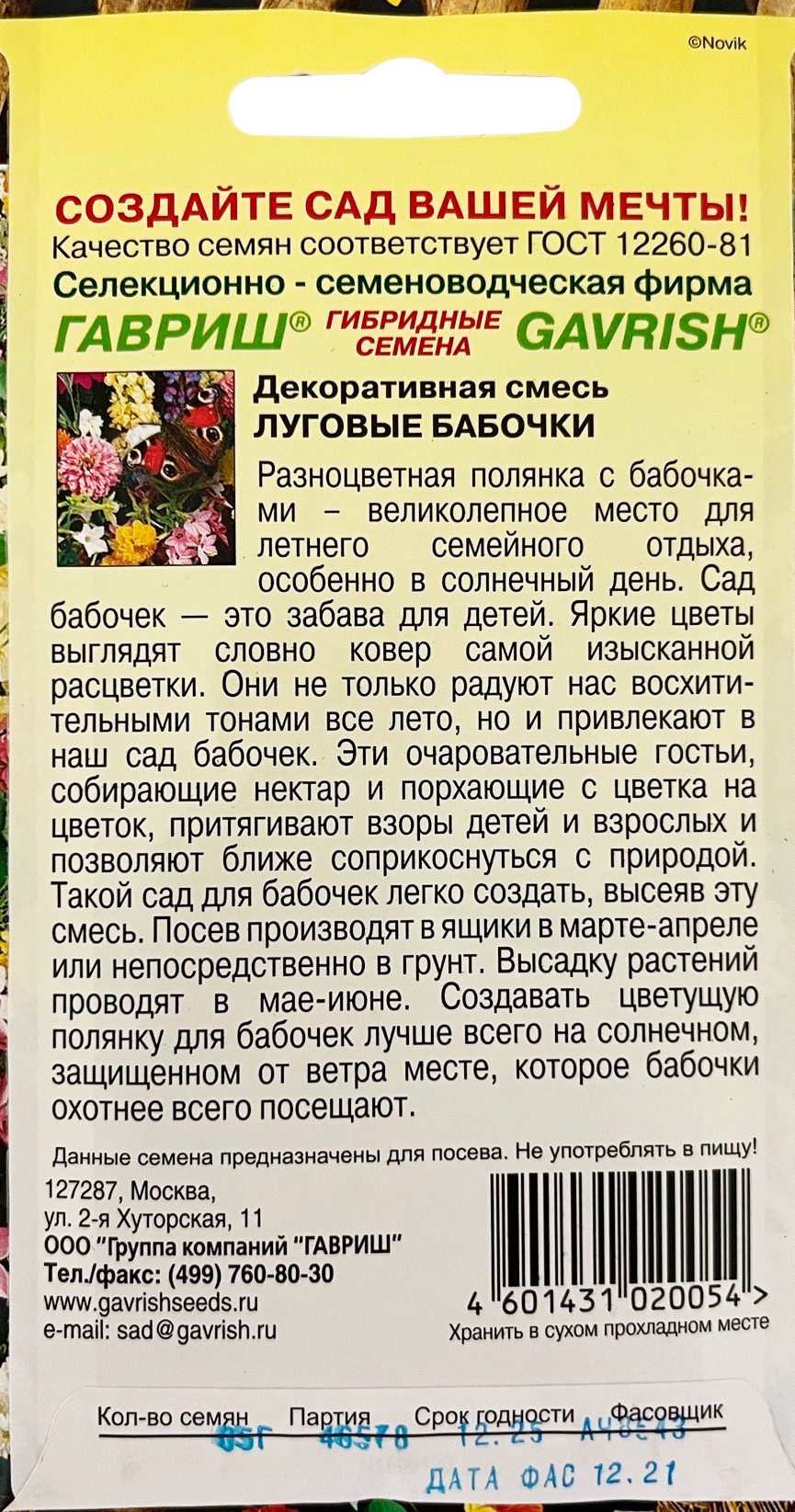 Декоративная смесь Луговые бабочки 0,5 г Н9Разноцветная полянка с бабочками - великолепное место для летнего семейного отдыха, особенно в солнечный день. Сад бабочек — это забава для детей. Яркие цветы выглядят словно ковер самой изысканной расцветки. Они не только радуют нас восхитительными тонами все лето, но и привлекают в наш сад бабочек. Эти очаровательные гостьи, собирающие нектар и порхающие с цветка на цветок притягивают взоры детей и взрослых и позволяют ближе соприкоснуться с природой. Такой сад для бабочек легко создать, высеяв эту смесь. Посев производят в ящики в марте- апреле или непосредственно в грунт. Высадку растений проводят- в мае-июне. Создавать цветущую полянку для бабочек лучше всего на солнечном, защищенном от ветра месте, которое бабочки охотней всего посещают.