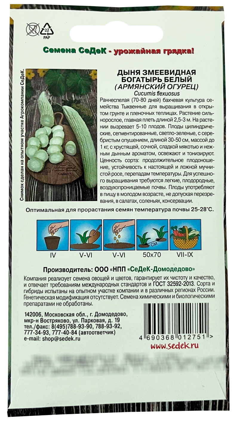 Дыня змеевидная богатырь белый (Армянский огурец) СеДеКРаннеспелая (70-80 дней) бахчевая культура семейства Тыквенные для выращивания в открытом грунте и пленочных теплицах. Растение сильнорослое, главная плеть длиной 2,5-3 м. На растении вызревает 5-10 плодов. Плоды цилиндрические, сегментированные, светло-зеленые, с серебристым опушением, длиной 30-50 см, массой до 1 кг, с хрустящей, сочной, сладкой мякотью и нежным дынным ароматом, освежают и тонизируют. Ценность сорта: продолжительное плодоношение, устойчивость к настоящей и ложной мучнистой росе, перепадам температуры. Для успешного выращивания требуются легкие, плодородные, воздухопроницаемые почвы. Плоды употребляют в пищу в молодом возрасте, не допуская перезревания, в салатах, соленьях, консервации.
