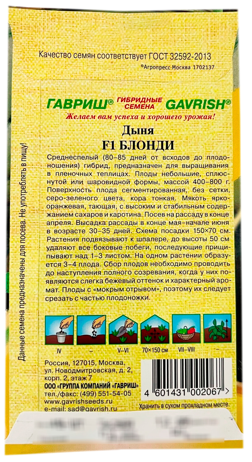 Дыня БЛОНДИ ГАВРИШСреднеспелый (80-85 дней от всходов до плодоношения) гибрид, предназначен для выращивания в пленочных теплицах. Посев на рассаду в конце апреля. Высадка рассады в конце мая – начале июня в возрасте 30-35 дней. Схема посадки 150х70 см. Растения подвязывают к шпалере, до высоты 50 см удаляют все боковые побеги, последующие прищипывают над 1-3 листом. На одном растении образуется 3-4 плода. Плоды мелкие, сплюснутой или шаровидной формы, массой 400-800 г. Поверхность плода сегментированная, без сетки, серо-зеленого цвета, кора тонкая. Мякоть ярко-оранжевая, тающая, с высоким и стабильным содержанием сахаров и каротина. Сбор плодов необходимо проводить до наступления полного созревания, когда у них появляются слегка бежевый оттенок и характерный аромат. Плоды с «мокрым отрывом», поэтому их следует срезать с частью плодоножки.
