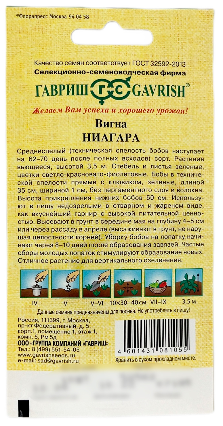 Вигна НиагараСреднеспелый (техническая спелость бобов наступает на 62-70 день после полных всходов) сорт. Растение вьющееся, высотой 3,5 м. Стебель и листья зеленые, цветки светло-красновато-фиолетовые. Бобы в технической спелости прямые с клювиком, зеленые, длиной 35 см, шириной 1 см, без пергаментного слоя и волокна. Высота прикрепления нижних бобов 50 см. Используют в пищу недозрелыми в отварном и жареном виде, как вкуснейший гарнир с высокой питательной ценностью. Высевают в грунт в середине мая на глубину 4-5 см или через рассаду в апреле (высаживают в грунт, не нарушая целостности корней). Уборку бобов на лопатку начинают через 8-10 дней после образования завязей. Частые сборы молодых лопаток стимулируют образование новых. Отличное растение для вертикального озеленения.
