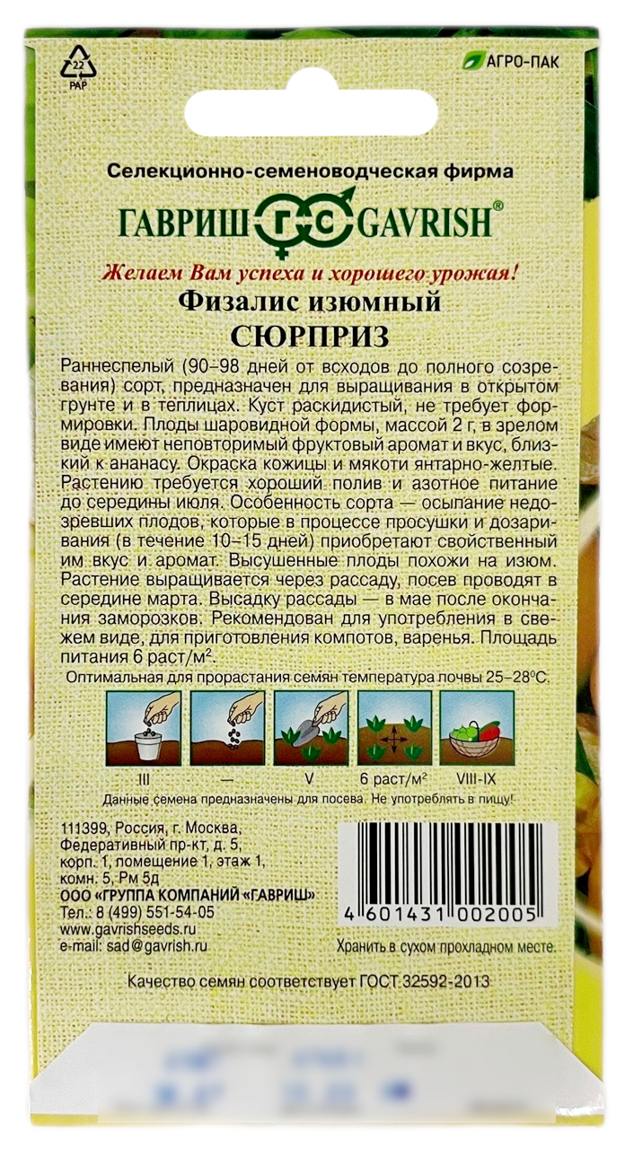 Физалис изюмный СЮРПРИЗ ГАВРИШРаннеспелый (90-98 дней от всходов до полного созревания) сорт, предназначен для выращивания в открытом грунте и теплицах. Куст раскидистый, не требует формировки. Плоды шаровидной формы, массой 2 г, в зрелом виде имеют неповторимый фруктовый аромат и вкус, близкий к ананасу. Окраска кожицы и мякоти янтарно-желтые. Растению требуется хороший полив и азотное питание до середины июля. Особенность сорта — осыпание недозревших плодов, которые в процессе сушки и дозаривания (в течении 10-15 дней) приобретают свойственный им вкус и аромат. Высушенные плоды похожи на изюм. Растение выращивается через рассаду, посев производят в середине марта. Высадку рассады — в мае, после окончания заморозков. Рекомендован для употребления в свежем виде, для приготовления компотов, варенья.