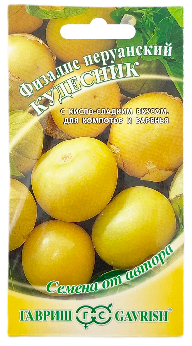 Физалис Кудесник ГАВРИШСреднеспелое (от всходов до созревания около 130-140 дней) теплолюбивое растение. Высота до 1.8 м в пленочной теплице. Опушение слабое. По сравнению с другими формами этого вида более вынослив к неблагоприятным внешним условиям. Междоузлия укорочены, что, наряду с крупноплодностью, приводит к значительному повышению продуктивности - до до 1.0 кг/ м2. Куст компактный. Является самоопылителем. Лепестки цветков желтые с темными пятнами у основания, что является одним из отличительных видовых признаков. Отличается выдающимися вкусовыми качествами зрелых плодов. Плоды массой 5-6г (до 9 г), коричневато-оранжевые, мякоть оранжевая, сочная, очень ароматная, кисло-сладкая, вкус и запах близки к землянике, ананасу и др. фруктам, как правило, есть легкая горчинка, которая, впрочем, воспринимается как грейпфрутовая. В пищу используется в свежем виде, а также для приготовления варенья, компотов и др. продуктов переработки высшего качества. Очень богаты витаминами, микроэлементами, пектином. Плоды с растения осыпаются очень редко, только при перезревании. Дозариваются слабо, только плоды начинающие желтеть. Плоды, созревшие на кусте обладают высокими вкусовыми достоинствами. Перед хранением необходимо тщательно просушить чехлики. Лежкость плодов этого сорта очень высока благодаря более плотной кожице. Отличительная особенность сорта - крупноплодность, компактность куста, и скороспелость. Посев семян на рассаду в середине февраля. Схема посадки в пленочной теплице - 2.5 растения/ м2. Физалис перуанский склонен к вегетативному пути развития, поэтому предпочтительнее легкие почвы, обильное питание и орошение только до середины июля, а с начала августа необходимо сдерживать рост растений, почти полностью прекратив поливы. Урожайность до 1.0 кг/ м2.