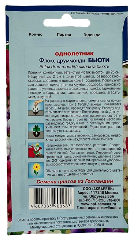 Флокс Бьюти АКВАРЕЛЬТравянистое однолетнее растение с цветами разной окраски, которые собраны в зонтиковидные соцветия. Куст компактный, высотой до 25 см. Подходит для балконов, вазонов. Украсит монокультурные цветники, клумбы, бордюры.