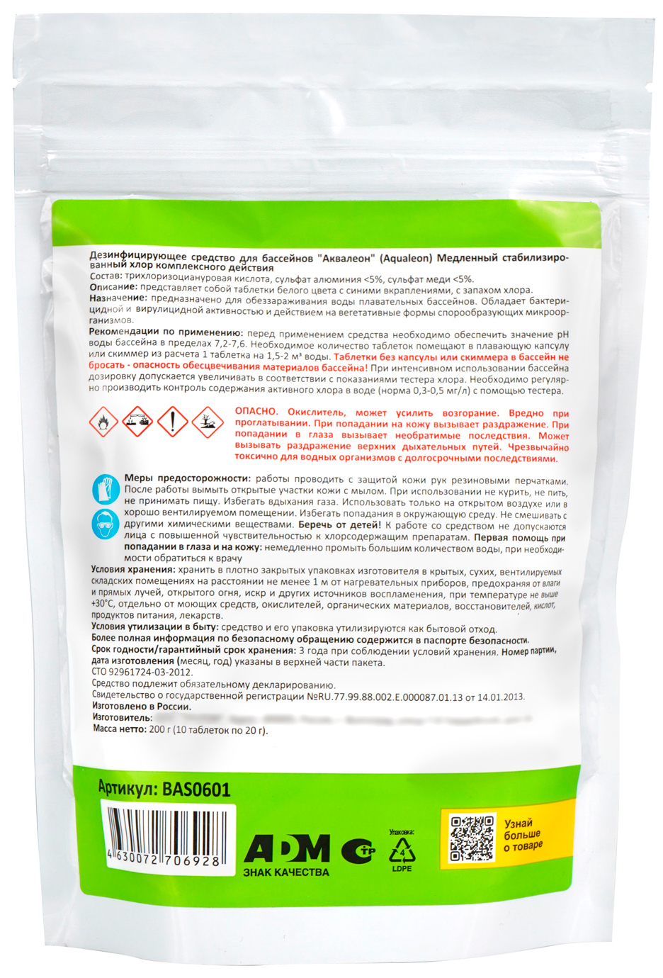 В составе содержится трихлоризоциануровая кислота - дезинфицирующее и бактерицидное средство для обеззараживания воды в плавательных бассейнах. Благодаря действующему веществу снижается рост водорослей и происходит активное воздействие на вегетативные формы спорообразующих микроорганизмов.
