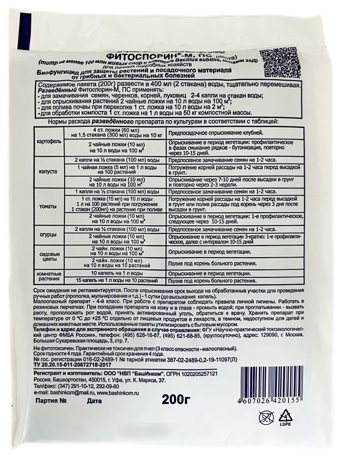 Содержимое пакте ( 200 г ) развести в 400 мл ( 2 стакана) воды, тщательно перемешивая. Разведенный Фитоспорин-М, ПС применять: