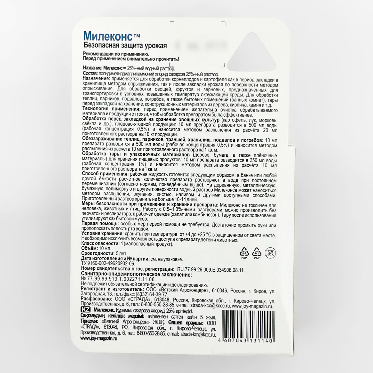 МИЛЕКОНС 10млПрименяется для обработки корнеплодов и картофеля как в период закладки в хранилища методом опрыскивания, так и после закладки урожая по поверхности методом опрыскивания. Для обработки овощей, фруктов и зерновых, предназначенных для транспортировки в условиях повышенных температур окружающей среды.