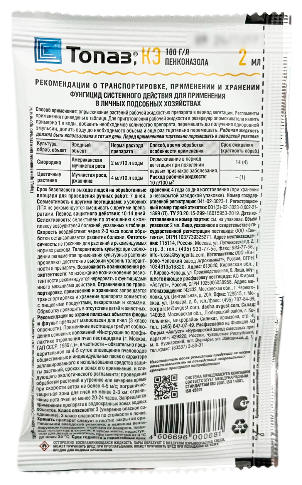 ТОПАЗ, КЭ 2млСостав: 100 г/л пенконазола.