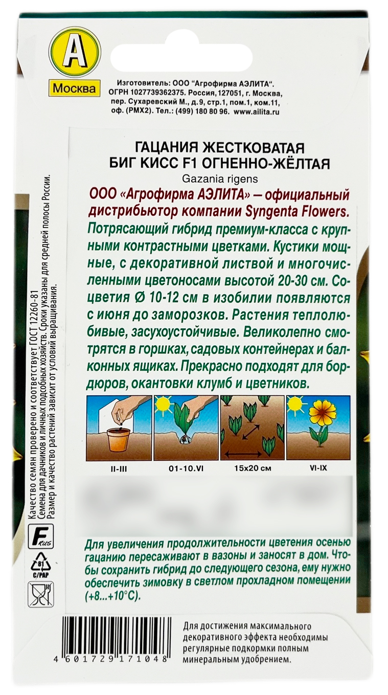 Гацания жестковатая БИГ КИСС F1 огненно-жёлтая АЭЛИТАПотрясающий гибрид премиум-класса с крупными контрастными цветками. Кустики мощные, с декоративной листвой и многочисленными цветоносами высотой 20-30 см. Соцветия ? 10-12 см в изобилии появляются с июня до заморозков. Растения теплолюбивые, засухоустойчивые. Великолепно смотрятся в горшках, садовых контейнерах и балконных ящиках. Прекрасно подходят для бордюров, окантовки клумб и цветников.