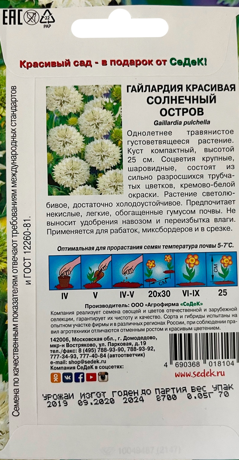 Гайлардия Солнечный Остров (вид красивая, кремово-белая) семена