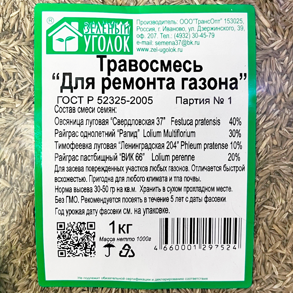 Газон Травосмесь Для ремонта газона 1кг Зеленый уголок семена