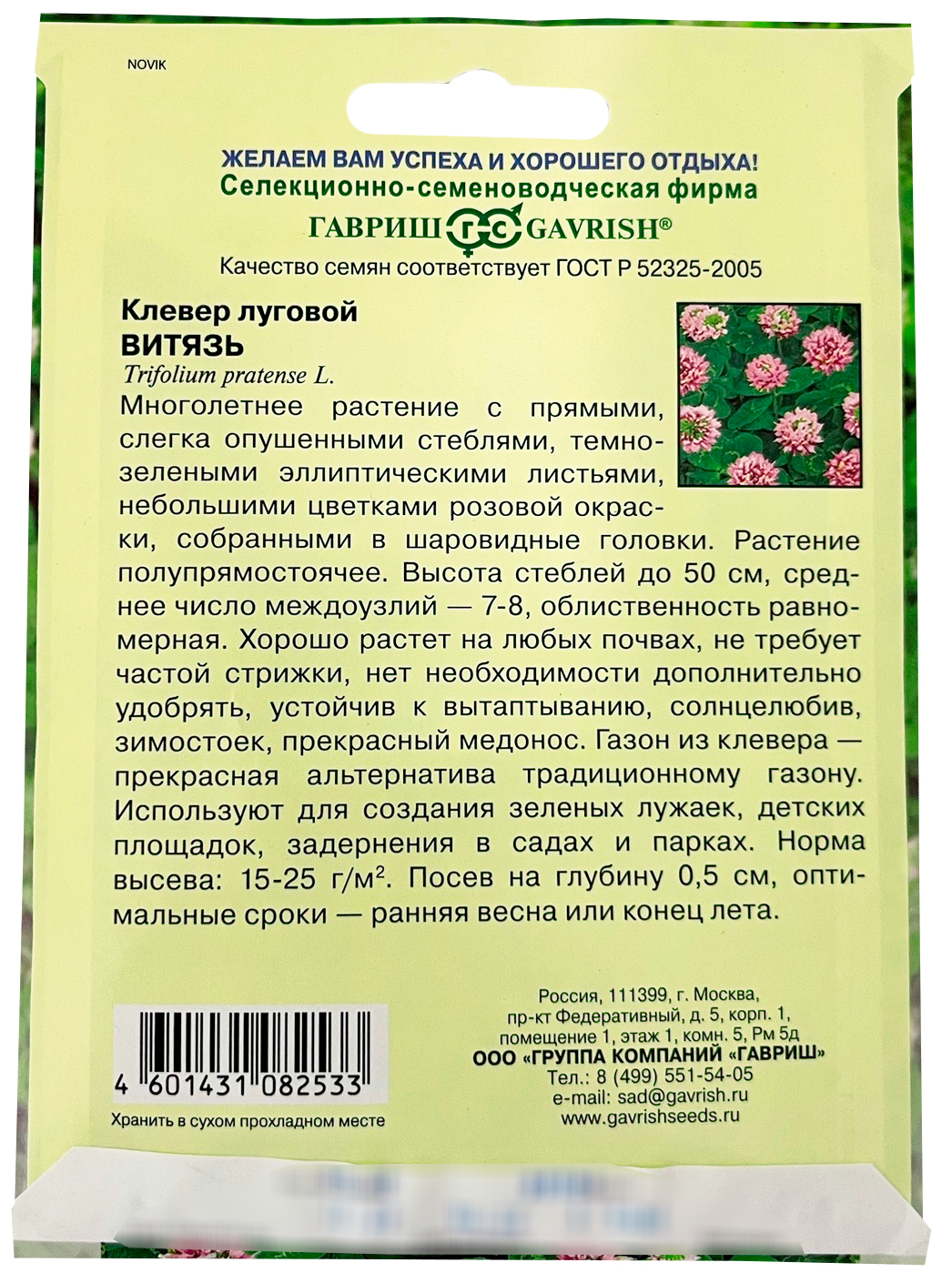 Клевер луговой ВИТЯЗЬМноголетнее растение с прямыми, слегка опушенными стеблями темно-зелеными, эллиптическими листьями, небольшими цветками розовой окраски, собранными в шаровидные головки. Позднеспелый (95-131 день до созревания) сорт. Куст полупрямостоячий. Высота стеблей до 50 см, среднее число междоузлий - 7- 8, облиственность равномерная. Высокоурожайный, хорошо растет на любых почвах, не требует частой стрижки, нет необходимости дополнительно удобрять, устойчив к вытаптыванию, солнцелюбив, зимостоек, прекрасный медонос. Газон из клевера - прекрасная альтернатива традиционному газону. Используется для создания зеленых лужаек, детских площадок, задернения в садах и парках. Норма высева 15-25 г/м2. Посев на глубину 0,5 см, оптимальные сроки - ранняя весна или конец лета.