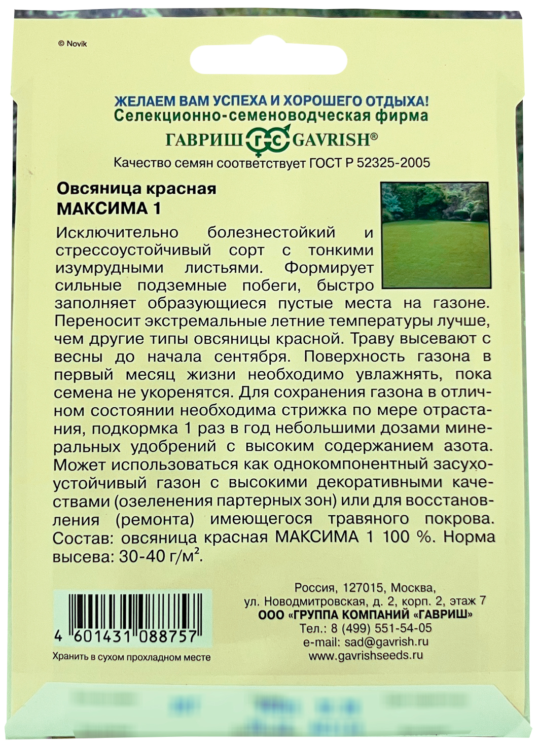 Овсяница красная Максима 1 ГАВРИШИсключительно болезнестойкий и стрессоустойчивый сорт с тонкими изумрудными листьями. Формирует сильные подземные побеги, быстро заполняет образующиеся пустые места на газоне. Переносит экстремальные летние температуры лучше, чем другие типы овсяницы красной. Траву высевают с весны до начала сентября. Поверхность газона в первый месяц жизни необходимо увлажнять, пока семена не укоренятся. Для сохранения газона в отличном состоянии необходима стрижка по мере отрастания, подкормка 1 раз в год небольшими дозами минеральных удобрений с высоким содержанием азота. Может использоваться как однокомпонентный засухоустойчивый газон с высокими декоративными качествами (озеленения партерных зон) или для восстановления (ремонта) имеющегося травяного покрова.