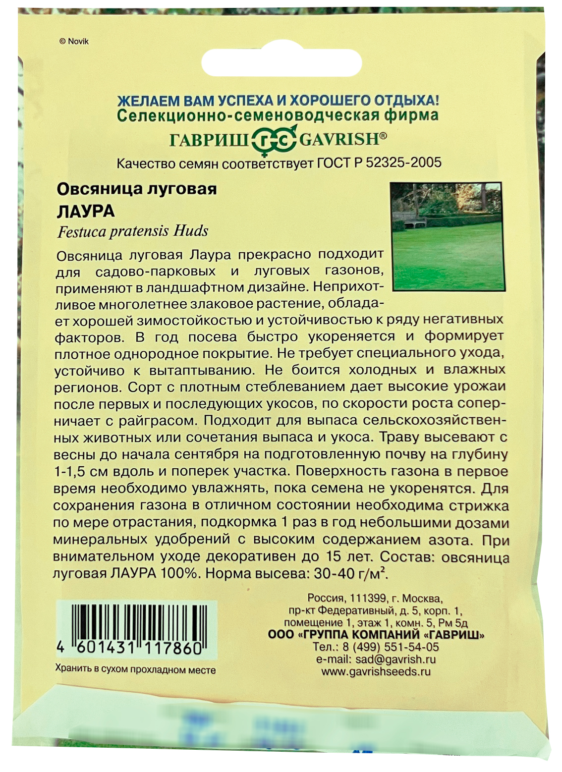 Овсяница луговая Лаура ГАВРИШОвсяница луговая Лаура прекрасно подходит для садово-парковых и луговых газонов, применяется в ландшафтном дизайне. Неприхотливое многолетнее злаковое растение обладает хорошей зимостойкостью и устойчивостью к ряду негативных факторов. В год посева быстро укореняется и формирует плотное однородное покрытие. Не требует специального ухода, устойчиво к вытаптыванию. Не боится холодных и влажных регионов. Сорт с плотным стеблеванием дает высокие урожаи после первых и последующих укосов, по скорости роста соперничает с райграсом. Подходит для выпаса сельскохозяйственных животных или сочетания выпаса и укоса. Траву высевают с весны до начала сентября на подготовленную почву на глубину 1–1,5 см вдоль и поперек участка. Поверхность газона в первое время необходимо увлажнять, пока семена не укоренятся. Для сохранения газона в отличном состоянии необходима стрижка по мере отрастания, подкормка 1 раз в год небольшими дозами минеральных удобрений с высоким содержанием азота. При внимательном уходе декоративен до 15 лет. Норма высева: 30-40 г/м2.