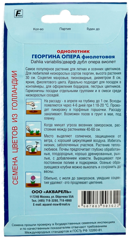 Георгина Опера фиолетовая АКВАРЕЛЬСамое популярное растение для летних и осенних цветников. Для любителей низкорослых сортов георгин, высота растения 30 см. Соцветия махровые, пионовидные, диаметром 8 см, яркие. Идеально подходит для посадок в контейнеры, для оформления бордюров, пестрых цветников. Гармоничны посадки отдельными группами и в смеси среди низкорослых соседей.