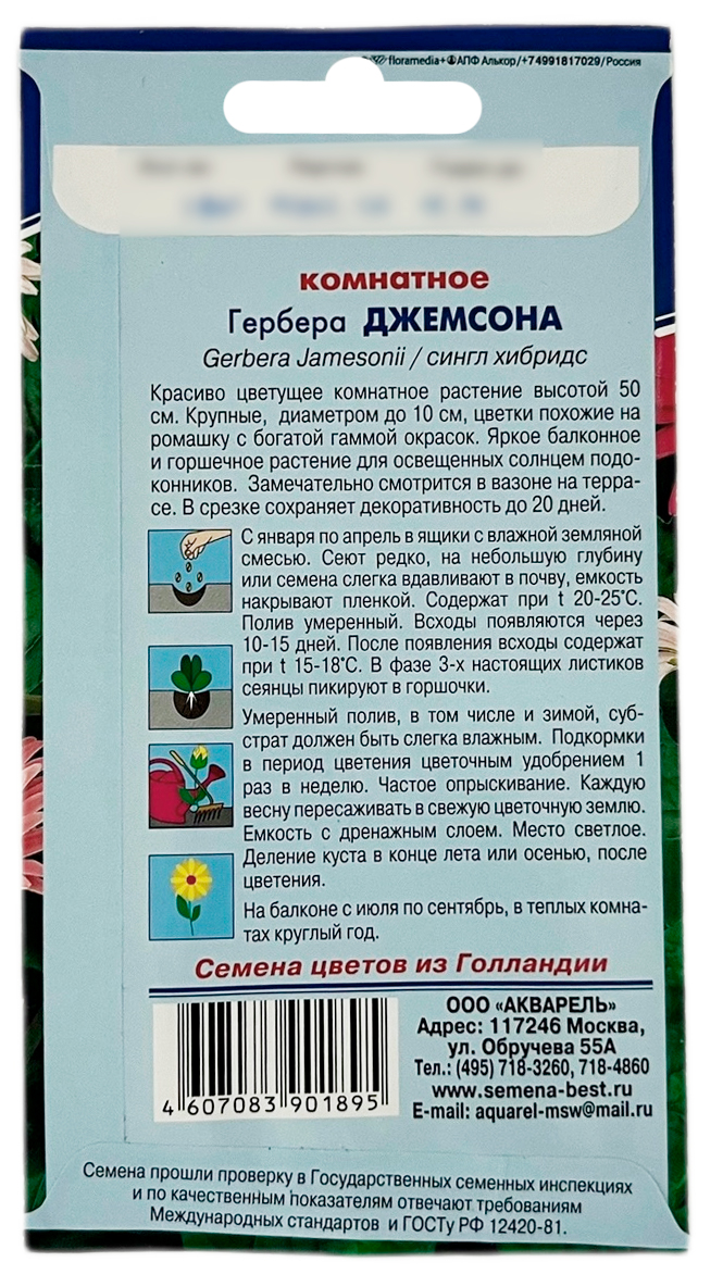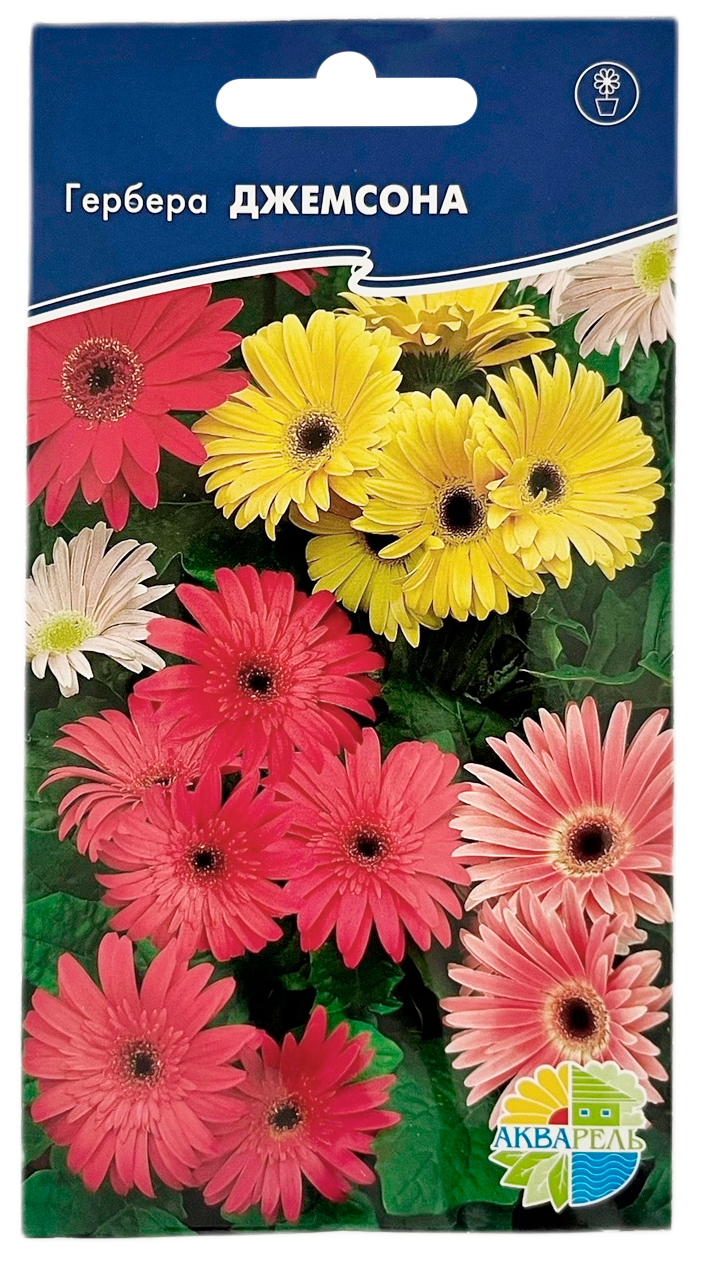 Гербера ДЖЕМСОНА комнатное АКВАРЕЛЬКрасивоцветущее комнатное растение высотой 50 см. Крупные, диаметром до 10 см, цветки, похожие на ромашку с богатой гаммой красок. Яркое балконное и горшечное растение для освещенных солнцем подоконников. Замечательно смотрится в вазне и на террасе. В срезке сохраняет декоративность до 20 дней.