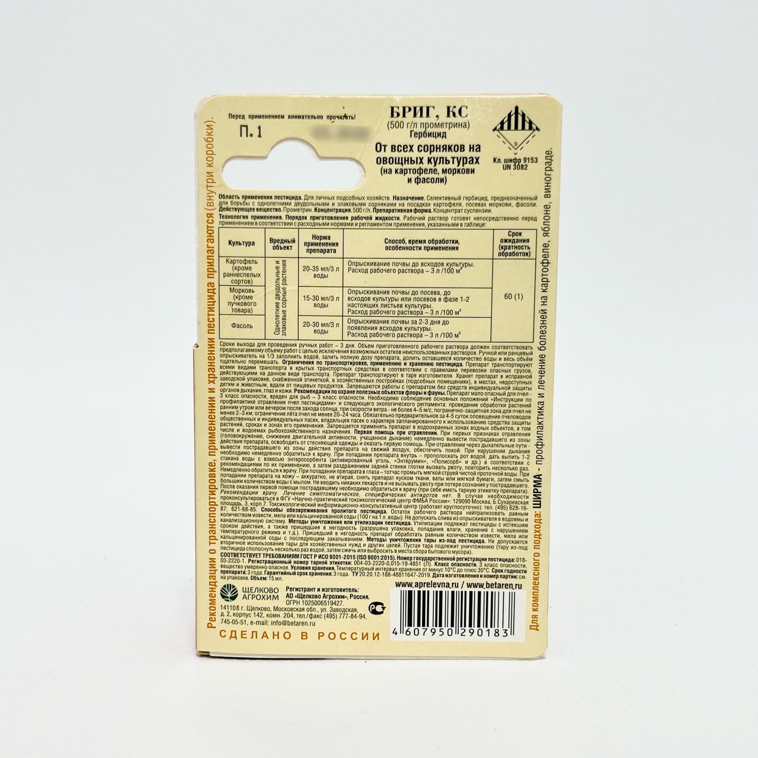 Селективный гербицид, предназначенный для борьбы с однолетними двудольными и злаковыми сорняками на посадках картофеля, посевов моркови, фасоли. Препарат замедляет процесс фотосинтеза и его действие заметно уже через 7-10 дней. Сорная растительность начинает желтеть, далее замедляется рост и происходит отмирание точек роста, при этом не нанося вред культурным растениям. Действие препарата наступает спустя 2-4 дня после появления всходов сорняков, через 7-12 дней наблюдается полная их гибель.